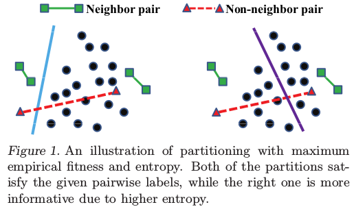有了第一项,还远远不够,因为第一项只保持能够在带标记的样本上获得很高的准确率,当不能保证在未标记的样本上也能获得较高的准确率,也就是过拟合问题,即在训练样本上performance很well,但是在测试样本上很bad。所以为了避免出现这个问题,作者对spectral hashing中要求的编码位求和相加得为0进行了分析与证明,最后得出要要求编码位求和相加为0就是要求信息熵最大。paper中的一个图很好的说明了上面这个情况: